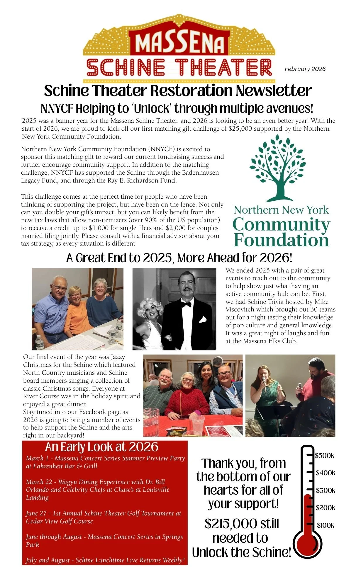 The restored Schine Theater will be a catalyst for economic growth in Massena. By attracting visitors and boosting local businesses, it will contribute to the revitalization of our downtown area. We believe the Schine will become a key driver of our community's future prosperity.
